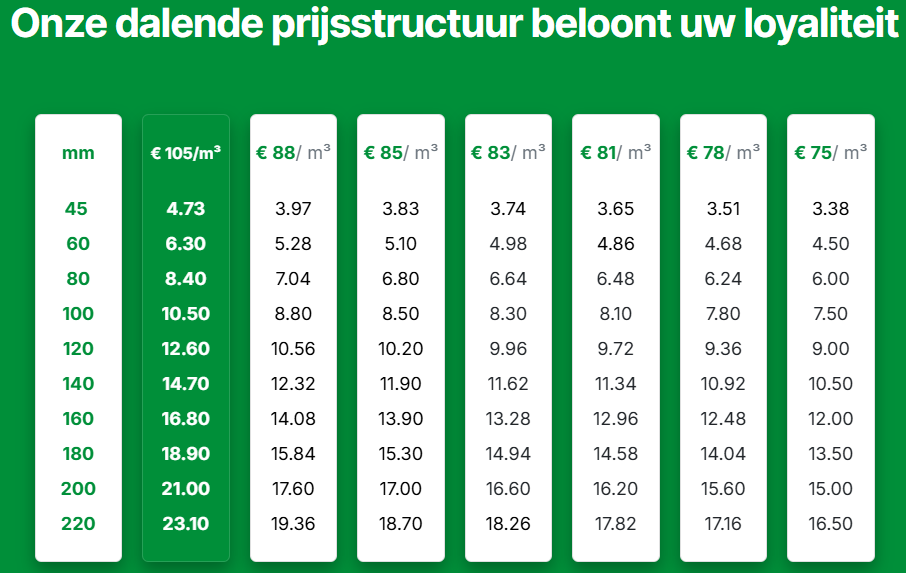 Met elke drempel die je bereikt (gemeten in m³ per jaar), ontgrendel u een nieuwe prijsklasse — Belonend voor u loyaliteit en het verhogen van u marge.